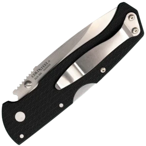- Folding knife made from AUS-10A stainless steel with a satin finish in a drop point style. Black textured G10 handles with a reversible pocket clip, uses cold steel's tri-ad locking mechanism.