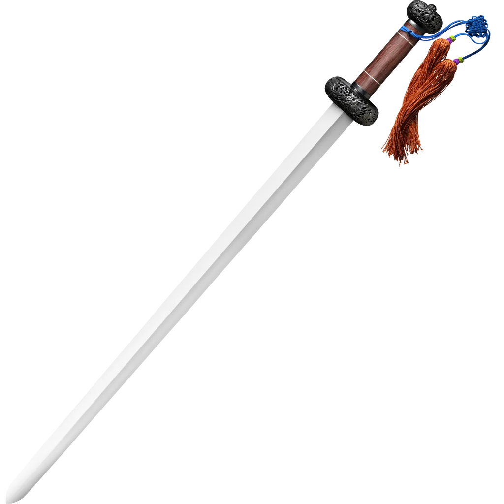 The Battle Gim is forged from our best Damascus Steel by talented smiths, it features a broad symmetrical point and a slightly wider, heavier blade than custom would dictate. The attractive Rosewood hilt is framed by a blackened iron guard and pommel. They’re embellished with an intricate filigree of traditional Chinese Peony flowers and leaves. The matching Rosewood scabbard is styled in a similar fashion on its chape, throat and ring mounts. Radiantly polished with twin sharp edges, making this piece an attractive Gim.