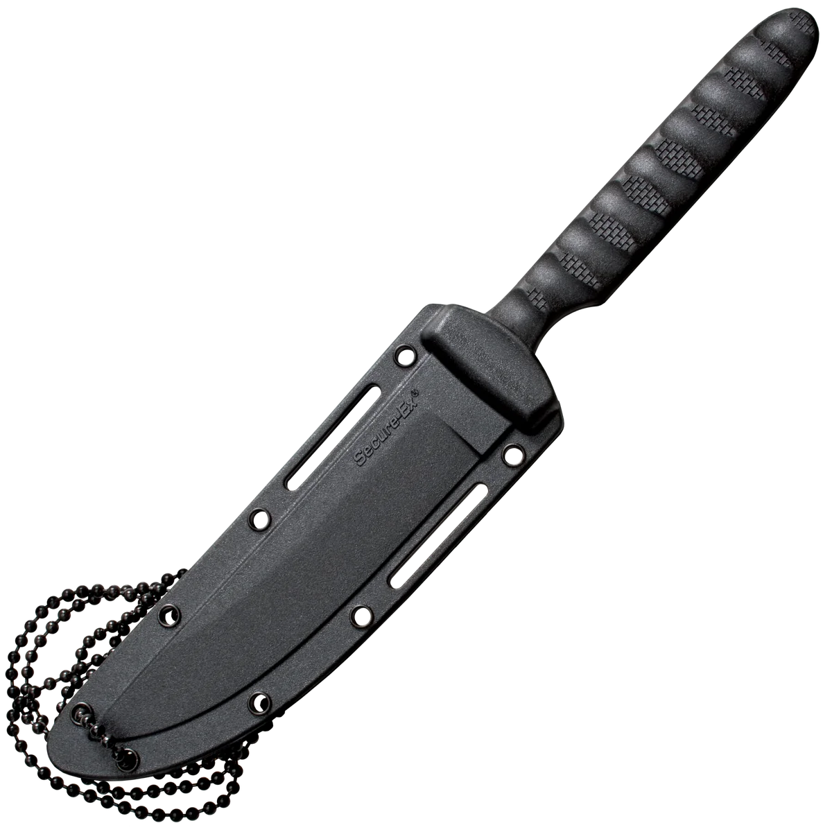- Fixed blade made from 4116 stainless steel with a satin finish in a bowie style. Black textured Griv-Ex handle with a lanyard hole, also comes with a secure-ex sheath steel and steel bead chain lanyard.