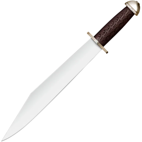 - Universally carried by Viking Chieftans, this Seax blade boasts an intricate hand-carved Malaysian Sal wood handle, complimenting the matching brass guard and pommel.