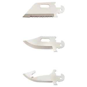 - Includes: a gut hook blade, a bowie blade, and our standard utility blade that features a serrated edge