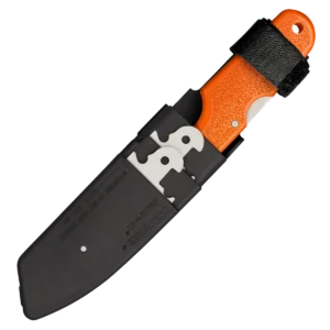 The issue most people have with a utility knife is weakness. Weak locking mechanisms, thin brittle blades, and an inability to do hard work. Cold Steel® has addressed this problem and created a utility knife that’s all about strength. And, it’s affordably priced! The Click-N-Cut features elements that are based on our extremely strong, Tri-Ad® lock, so it’s built for strenuous cutting chores. It comes complete with three interchangeable blades. There is a drop point blade and serrated and plain edged versions of our utility blade. The blades are double the thickness of most blades on the market, so they can stand up to the most strenuous cutting, scoring and scraping tasks you can imagine. Exchanging a blade is easy. The handle has a lock bar release, similar to the release on a folding knife. When the lock bar is pressed the blade slides easily out. Keep the lock bar pressed and slide a new blade in and release the lock bar and the blade will “click” into place. The Click-N-Cut includes a belt sheath that will hold the knife with one of the blades installed and it has integral pockets for the two remaining extra blades. Extra replacement blades are also available for purchase separately. This new Hunter’s model has a blaze orange handle and comes complete with three blades designed for a hunter’s needs. There is a Bowie blade, for sticking and skinning, a gut hook blade for field dressing and our standard serrated utility blade for general chores.