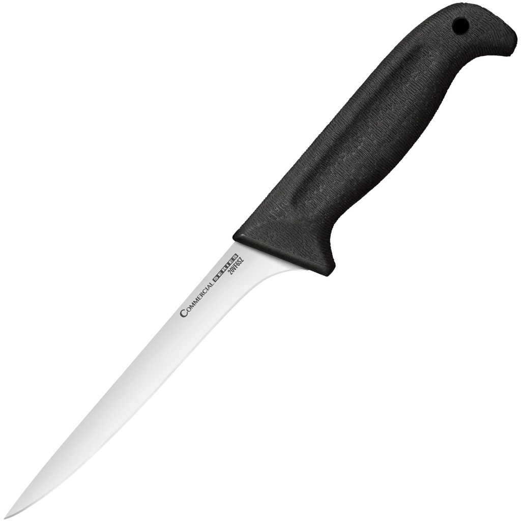 Cold Steel's series of kitchen knives, the Commercial Series, will race through just about any task you can imagine. Theses blades are cryo quenched and then precision flat ground for maximum cutting power. All models in the series come with a razor sharp edge that lasts and lasts. The handles are, in a word, terrific! Carefully designed to ensure a strong, secure, yet comfortable grip, they are made from Kray-Ex for maximum strength without adding unnecessary weight.