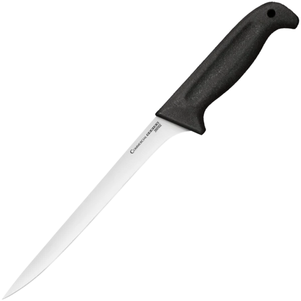 Cold Steel's series of kitchen knives, the Commercial Series, will race through just about any task you can imagine. Theses blades are cryo quenched and then precision flat ground for maximum cutting power. All models in the series come with a razor sharp edge that lasts and lasts. The handles are, in a word, terrific! Carefully designed to ensure a strong, secure, yet comfortable grip, they are made from Kray-Ex for maximum strength without adding unnecessary weight.