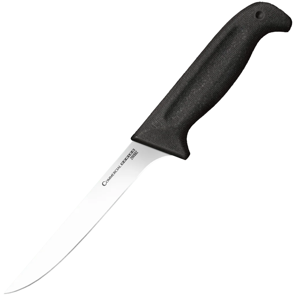 Cold Steel's series of kitchen knives, the Commercial Series, will race through just about any task you can imagine. Theses blades are cryo quenched and then precision flat ground for maximum cutting power. All models in the series come with a razor sharp edge that lasts and lasts. The handles are, in a word, terrific! Carefully designed to ensure a strong, secure, yet comfortable grip, they are made from Kray-Ex for maximum strength without adding unnecessary weight.
