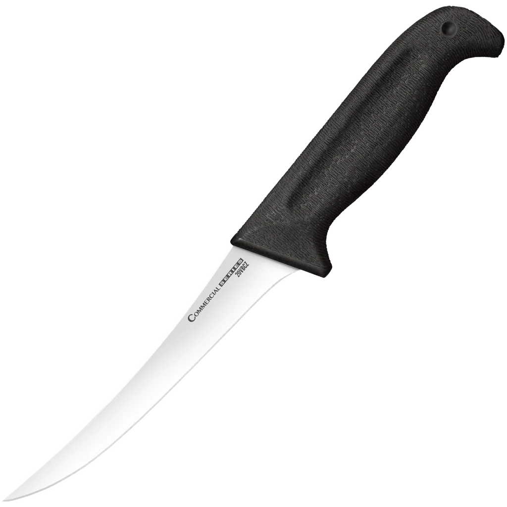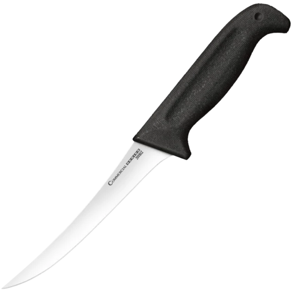 Cold Steel's series of kitchen knives, the Commercial Series, will race through just about any task you can imagine. Theses blades are cryo quenched and then precision flat ground for maximum cutting power. All models in the series come with a razor sharp edge that lasts and lasts. The handles are, in a word, terrific! Carefully designed to ensure a strong, secure, yet comfortable grip, they are made from Kray-Ex for maximum strength without adding unnecessary weight.