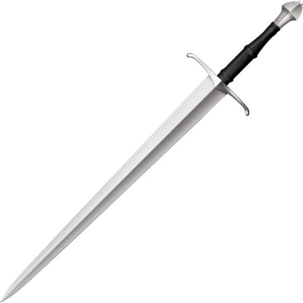 While Japanese sword cutting competitions have been popular for many decades, there has been little or no interest in exploring the cutting potential of Western swords until very recently. Now in response to this awakening Cold Steel would like to encourage it by offering our own Competition Cutting Sword. Broadly based on the Arbedo, it’s intended for contests using rope, mailing tubes, tatami mats and similar soft targets. The thin, wide, double edged blade is hand forged from 1050 high carbon steel with a hard spring temper and is delivered fully sharpened and polished. For maximum control and leverage, when attempting big cutting feats, our Competition Cutting Sword comes with a substantial leather covered wood handle that will accommodate one or both hands. To protect your fingers and fend off opposing blades, a simple yet effective double quillon steel guard is provided. To help counter balance its wide blade, it’s supplied with an attractive flared, lozenge shaped steel pommel and comes encased in a thick and sturdy, black leather scabbard with matching steel throat and chape.