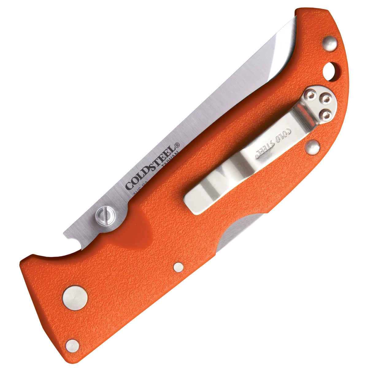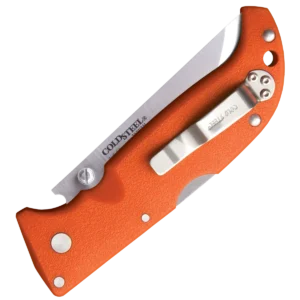 - Folding knife made from AUS-8A stainless steel with a satin finish in a straight back style. Orange Griv-Ex handle with a pocket clip and lanyard hole. Use's cold steel's Tri-Ad locking mechanism.