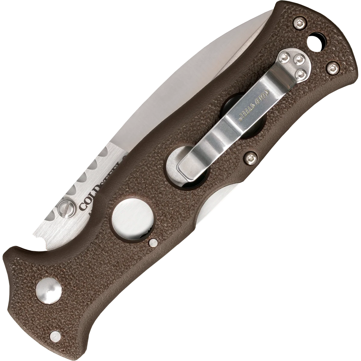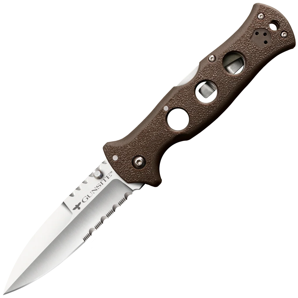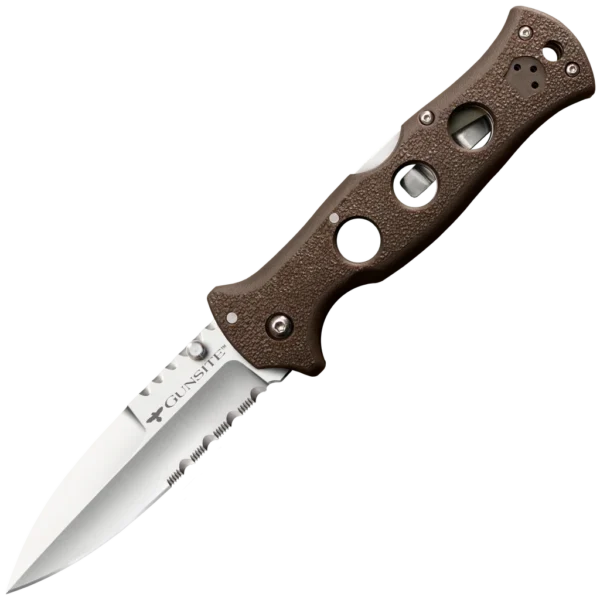The Gunsite® is a specialized version of our Counter Point 1. It's stiletto-inspired spear point blade has a distinctively pronounced false edge with jimping and a half serrated blade, combining to make a blade that not only looks great, but delivers a show stopping performance! Made from Japanese AUS10A Steel, the Gunsite is highly corrosion and stain resistant and takes a very sharp and durable edge. The Gunsites handle is made from Griv-Ex and reinforced with heat treated aluminum liners, making it not only very strong, but comfortable and secure in almost any grip imaginable. For added strength and safety, we equipped the Gunsite with our famous Tri-Ad locking mechanism, proven again and again to be incredibly strong and shock resistant.