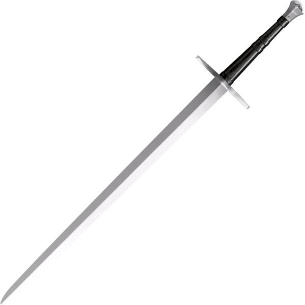 We would be hard pressed to think of a more versatile or effective sword than the Hand-and-a-Half Sword we offer here. For a sword of this size it is remarkably light and fast, tipping the scales at approximately 3 lbs. Its 33.5" long blade is quite wide and provides strong cutting performance. Its long handle is suitable for both a one- or two-handed grip and is fashioned from wood covered in black leather. To balance the long blade the butt is capped with a decorative 'scent stopper' pommel that provides a solid counterweight and can function as a durable striking surface.