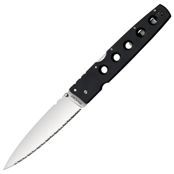 In many ways, the Cold Steel Hold Out series are ideal “EDC” or every day carry knives – providing the comfort that comes from carrying a high quality performance folder but in an astoundingly lightweight and easy to carry package. Their beautiful satin polished S35VN steel blades are extremely functional. They are flat ground from the spine, with a shallow “V” cross-section culminating in a razor sharp hand-honed edge. Continuously curved from the heel to the needle-sharp tip, the blades make short work of daily tasks and cutting chores, around the campsite or in the wildnerness.