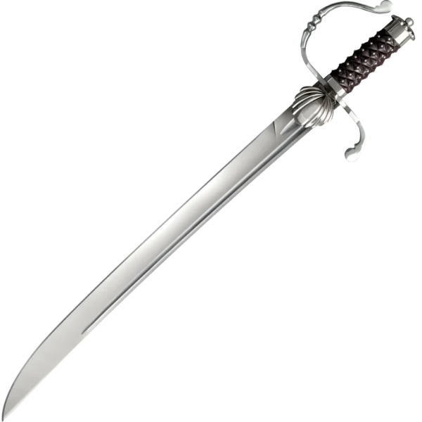 The 'Hanger' is an iconic short-bladed sword (seldom over 26") that gained popularity in Europe and the Americas during the 16th and 17th centuries. Among the reasons for its popularity, outside of the dictates of fashion, was that it was an immensely handy, effective sword that was well-suited whether used on foot, horseback or aboard ship. Like many originals, this version is stylish. The blade is satin-polished with multiple fullers and a false edge. The intricately hand-carved handle is made from Rosewood and ornamented with nickel-silver pins. The scabbard’s design complements the sword; it is made from heavy black leather and is capped at each end with an embossed nickel-silver throat and chape.