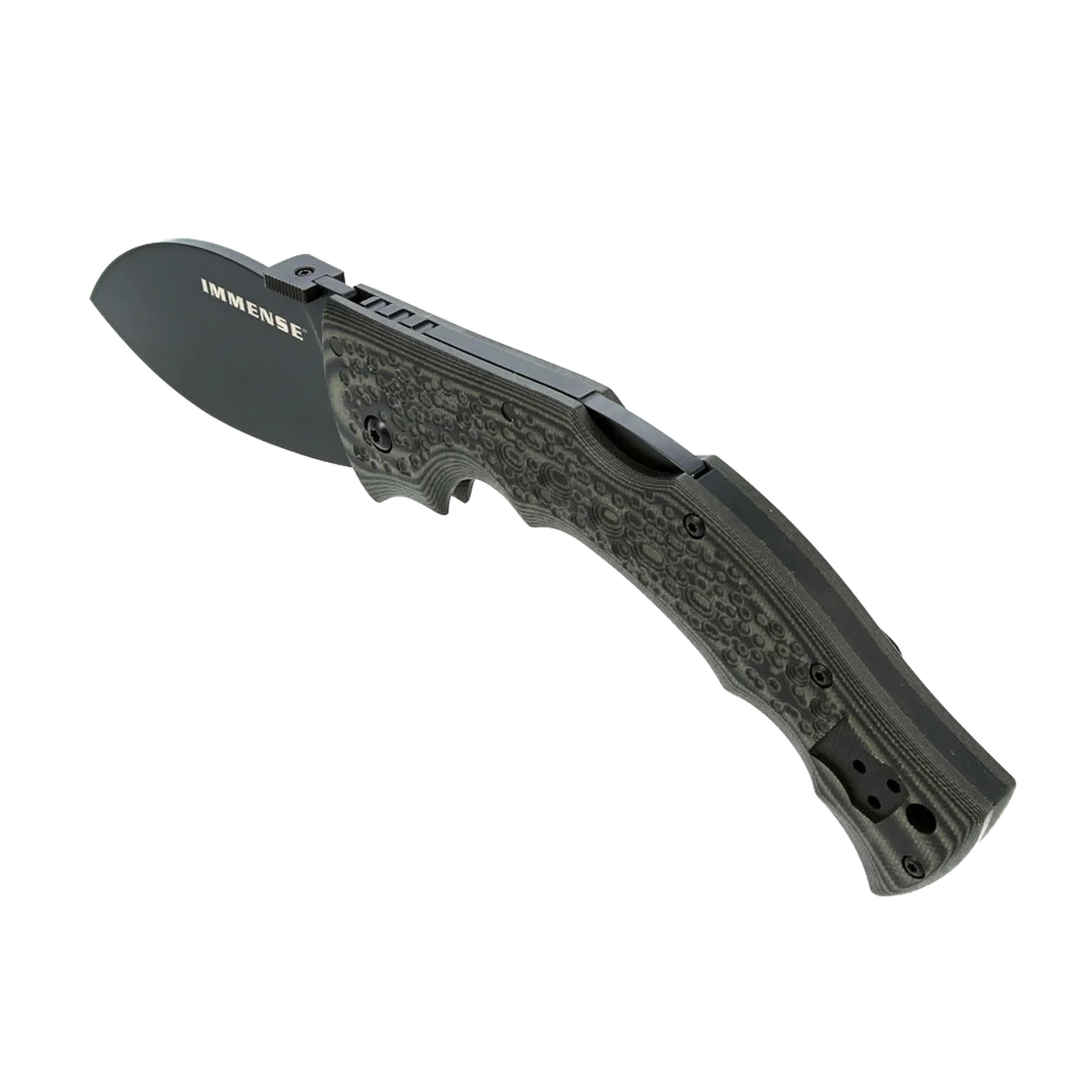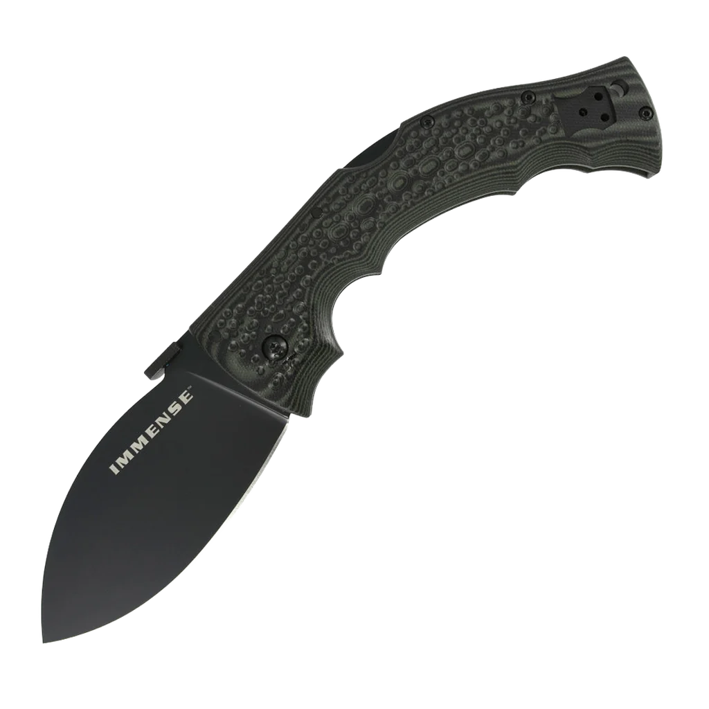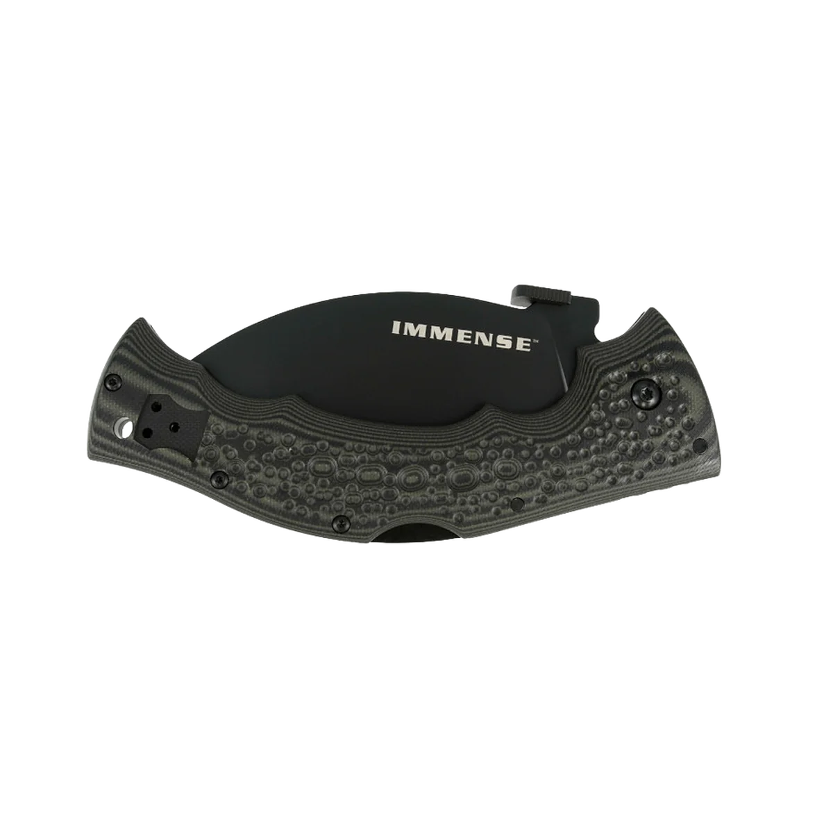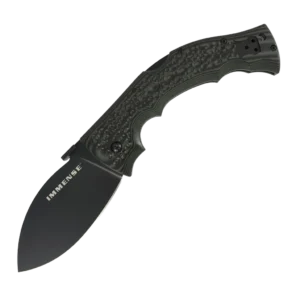 The Immense is a cutting-edge folding knife that combines strength, precision, and durability in a sleek package, ideal for avid adventurers. It features our renowned Tri-Ad® locking mechanism, which ensures a secure and reliable lockup whenever the blade is deployed. The 4" drop point blade is crafted from premium XHP steel, known for its exceptional edge retention and corrosion resistance, and is coated with a durable black DLC finish for added protection against the wear and tear that comes with repeated outdoor use and exposure to the elements. This razor-sharp blade features a flat grind for superior cutting performance and is controlled by an ergonomic G-10 handle that provides a comfortable and secure grip, even in wet conditions. The scaled, textured surface delivers maximum control and stability, allowing for effortless handling through any undertaking.