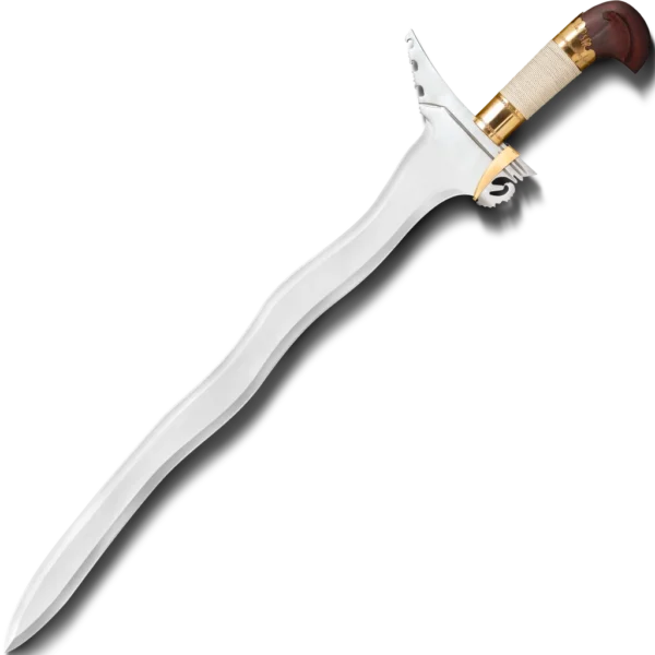 The Cold Steel Kris series, which includes a sword and dagger, is something we hope all practitioners of Filipino martial arts and sword aficionados will approve of and want to add to their collection. The blades are made from 1055 carbon steel with a hard spring temper. They are satin polished and come fully sharpened. In profile, the Cold Steel Kris blades feature a moderately undulating blade shape with three concave curves and a long, descending spear point found on almost all Kris swords. This blade shape strikes a good balance between cutting power and the sharp, sturdy points cut well at extreme range, but are acute enough to pierce efficiently. The base of the blades terminate in traditional, decorated "file cut" flanges with the shorter protecting the finger and the longer protecting the thumb wrist and lower forearm. The classic handles emphasize strength and durability over fashion. Hand carved out of exotic Sal hardwood, they're wrapped with wire, and embellished with a brass bolster. Every Kris comes with an equally sturdy and practical scabbard, ready to be displayed on your wall.