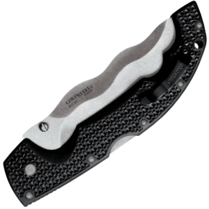 - Folding knife made from AUS-10A Stainless Steel with a stonewash finish in a kris style. Black Griv-Ex handle with a lanyard hole and reversible pocket clip. Uses the Tri-Ad locking mechanism.