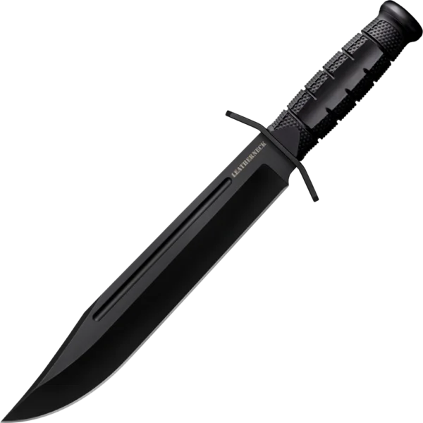 The Leatherneck Bowie has a wide bowie styled blade made from German D2 steel, and is 10.5 inches long. Like the others in the Leatherneck series, it has a non-reflective black finish. It features a distinctive groove along most of its length, and of course it comes hair shaving sharp! The Kray-Ex handle is based on Cold Steels other Leatherneck's standard design but it is enhanced with a longer guard and forward curving quillons. It comes complete with a SecureEx sheath with fully detachable and ambidextrous belt loop.