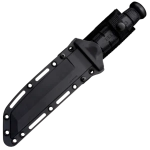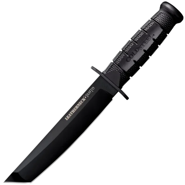 This tough, fixed blade has a distinct and iconic blade style, which has been proven to be exceptionally popular with our brothers and sisters in the armed forces: The 39LSFCT Leatherneck-Tanto features the classic signature Cold Steel style Tanto blade with a stout reinforced tip for extra strength and durability. The blade is made from German D2 Tool Steel and finished with a non-reflective, highly scratch resistant black powder coating. To keep the fingers from sliding forward onto their keen edge, the Leathernecks come with a superior solid steel guard. Made of thick steel with double quillons that are turned slightly forward to provide excellent protection for your hand while offering minimal interference in the use of these knives when performing utility tasks. The handles are made of deeply checkered Griv-Ex that totally encompasses the Leathernecks extra wide, full tang. They offer unsurpassed gripping power through their palm hugging oval cross section and unique finger trough. The Leatherneck handle is capped with a thick, machined steel butt cap (not cheap casting or plastic like others on the market today) so they can also deliver frightful blows with the butt or even double in an emergency as a hammer. To carry the Leatherneck safely and conveniently in all environments, it comes with a sturdy and versatile Secure-Ex sheath, complete with fully detachable and ambidextrous belt loop.