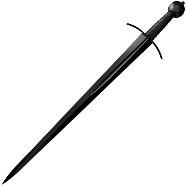 The Arming Sword takes its inspiration from the side arm of choice for many of histories foot soldiers and journeyman warriors. Smaller and more agile than many of the heavier swords on the battlefield, this double edged blade was light enough to be easily wielded with one hand, and stiff enough to find vulnerable gaps in a knight’s plate armor, or burst through his mail! Cold Steel's interpretation of this sword is made from expertly heat treated carbon steel and richly blued to an inky black finish. Featuring pronounced upturned parrying quillons, a fluted leather grip, and a counter balancing wheel pommel, the Arming Sword is beautifully balanced, and, with all blued steel fittings, it’s good looking too! The Man at Arms Arming Sword is sold complete with a hand stitched black leather scabbard with a steel throat and chape.