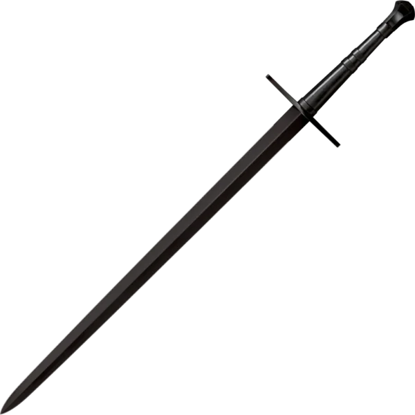 Cold Steel is quickly becoming the go-to company for functional, affordable, reproduction swords and knives. Their stuff is great for reenactors, or folks who just like chopping stuff up in the woods with old style tools! The Man at Arms was a stalwart and dependable man who exhibited great martial prowess. He was capable and competent veteran. Although he was not a Knight, he went and trained alongside them as a brother in arms. To honor these rugged, reliable, salt-of-the-earth warriors Cold Steel has created a range of true journeyman’s tools that they have called the Man at Arms Collection. These practical swords lack the gleaming blades and polished silver steelwork of their other swords, but they pack a resounding punch where it counts! Approximating the quality and performance of these high end swords, the Man at Arms collection features a selection of some of the finest high performance blades but at a markedly reduced price. Their fully sharpened and blued blades have a distinctive gun metal finish that compliments their black leather handles, and when well-oiled they are gleamingly beautiful in their own right. If you always wanted a Cold Steel sword, but couldn't afford one, the Man at Arms collection is for you.