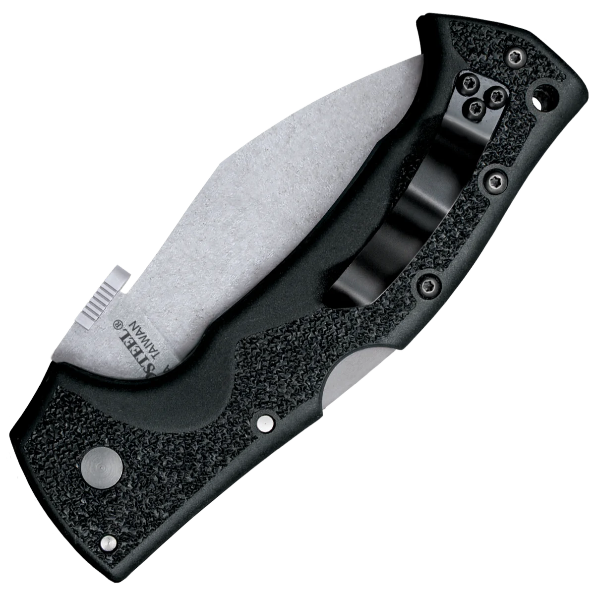 - Black textured Griv-Ex handle with a reversible pocket clip and lanyard hole, uses Cold Steel's Tri-Ad locking mechanism.