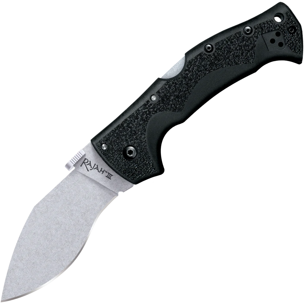 Designed by custom knife maker Andrew Demko, the Cold Steel Rajah series has proven to be both fan favorites and instant classics!Available in two sizes, their unique blade shape presents their thin, flat ground edges at just the right angle so they naturally exceed other knives of the same size and weight. The Rajah handle also shares similar aesthetic lines and design nuances with traditional Kukris, with the addition of strategically placed curves for optimum grip and control.We’ve also equipped the Rajah series with our world renowned Tri-Ad locking mechanism, which has proven itself again and again to be amazingly strong and shock resistant. Try our Rajah series today and experience for yourself the power of a Kukri that can fit in your pocket!