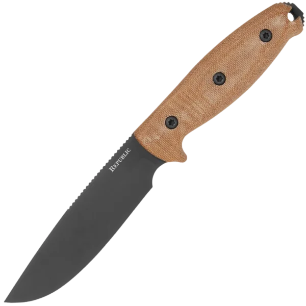 Introducing the ultimate companion blade for every outdoor pursuit: the all-new Republic, a rugged drop-point bushcraft survival knife from Cold Steel. The Republic is the honest, straightforward fixed blade knife that you can depend on. The USA made Republic features a 5-inch S35VN steel blade with an HRC58-60 hardness rating and robust 3.9mm thickness, its precise craftsmanship provides a versatile, reliable tool that excels in even the most demanding wilderness environments. Further enhancing its durability is a rugged Ionbond finish that offers not only exceptional corrosion resistance but also a sleek aesthetic that’s sure to strike a chord with any wilderness adventurer. And, weighing in at just 8.4 ounces, the Republic ensures effortless carry, even when stowed in the included premium leather sheath. The dependable blade attaches to a 5-inch sure-grip Micarta handle that minimizes the risk of slippage even in wet conditions. What's more, the handle is simple to remove, so you can quickly adapt the tool to your specific needs or preferences. Jimping and choil on the blade provide added thumb grip and control when performing delicate tasks, while the integrated lanyard hole offers a wide array of carrying options, including a way to secure the knife to your gear or wrist, so it’s always within reach.