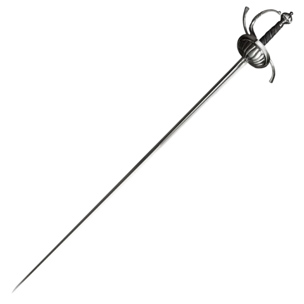 Its long, double-edged blade was ideal for delivering the point at great distances. Its elaborate hilt (evolving from rings, bars and quillons, to shells, and chiseled cups) offered excellent protection and caught or deflected blows with ease. Sadly, the rapier eventually succumbed to the dictates of fashion and gave way to smaller swords. Our modern interpretation of this historical classic has a long, narrow blade with a single wide fuller to assure perfect balance. Its hilt features a classic ribbed shell and multiple bars, quillons and a knuckle bow for hand protection. The grip is made of wood covered with rich black ray skin and wire and terminates in a heavy ribbed pommel that serves as a perfect counter balance to our Rapier's blade.