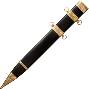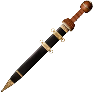 The Roman Gladius is perhaps the most well-known piece of ancient weaponry. It's simple and long, double edge blade which had a long point, made it ideal when faced against the advancing armour of the time. Cold Steel's interpretation is not a reproduction of a specific ancient Gladius, but is a collection of this venerable sword's major features. The blade, for example, has the traditional shape, but, unlike the ancient version, is made from high carbon steel with a spring temper. It is fully sharpened on both edges and has a fine mirror polish. The point is long, but sturdy enough to resist bending or breaking. It also features a Rosewood grip, carved, and decorated in the classical style. The wood scabbard is covered in black leather and accented with a throat, chape, and carrying rings made of solid brass.