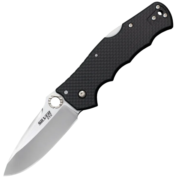The Silver Eye has a spear point blade and a carbon fiber Handle. The Cold Steel Silver Eye offers a high performance folder with a sophisticated design from custom knife-maker Andrew Demko. It has a hand-honed razor sharp blade made from S35VN steel with a plain edge. The handle is constructed from beautiful carbon fiber scales and Cold Steel's reliable Tri-Ad locking system. Brass details on the pocket clip and thumb hole opener further add to the aesthetic appeal of this knife. This model is fully ambidextrous with a reversible pocket clip and a thumb hole opener. Get high performance craftsmanship and collectible style with the Cold Steel Silver Eye.