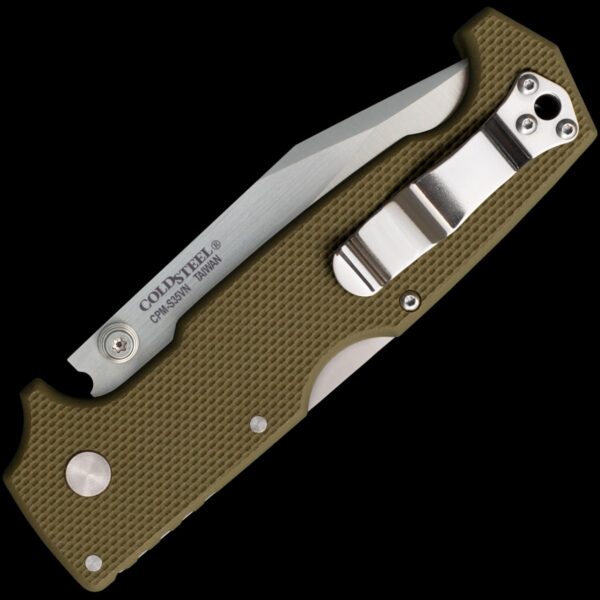 - Folding blade made from S35VN stainless steel with a satin finish in a clip point style. OD Green textured G10 handle with a reversible pocket clip and lanyard hole, uses Cold Steel's Tri-Ad locking mechanism.