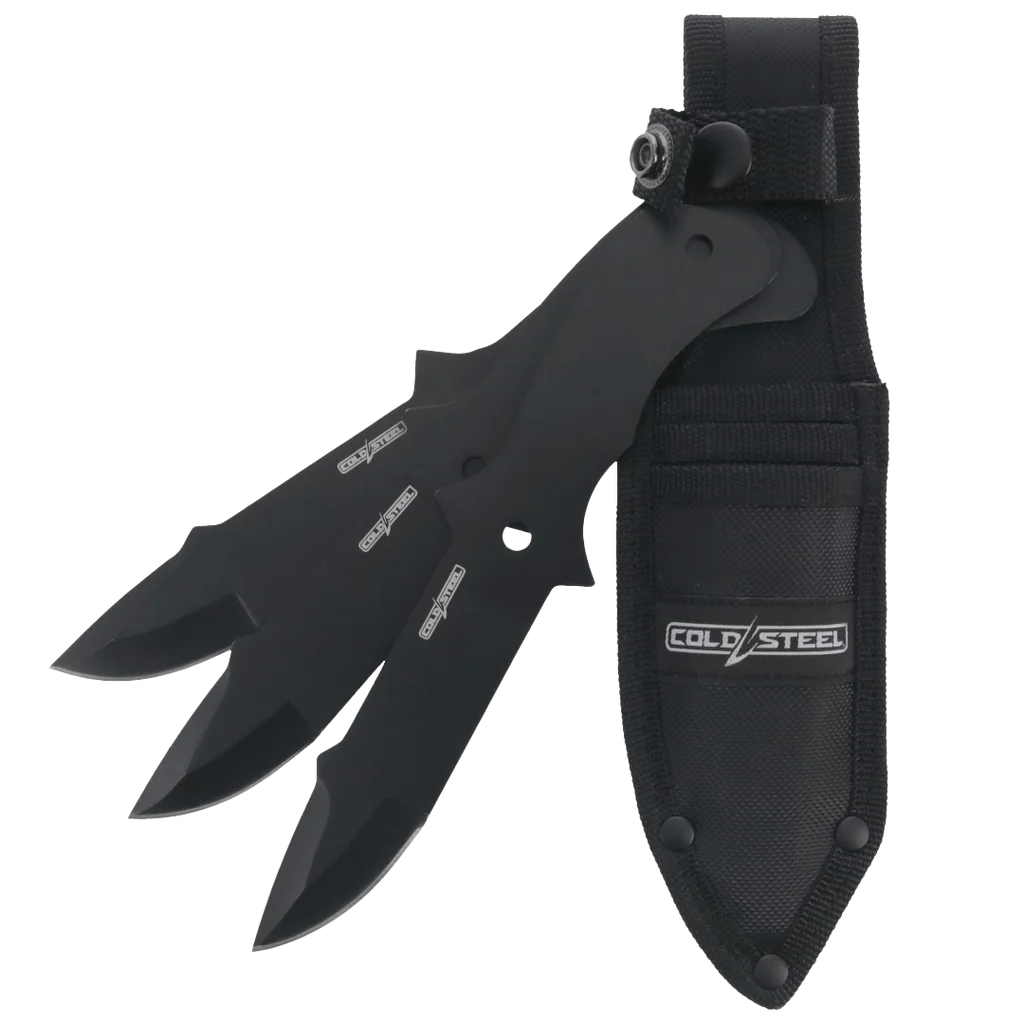 These stylized throwing knives sail through the air. Their balance, aerodynamics, and proportions make them great throwing knives for backyard target practice. The set of three knives are made from tough 420SS steel and are protected by a scratch resistant black oxide coating. Includes a nylon sheath that safely carries all three.