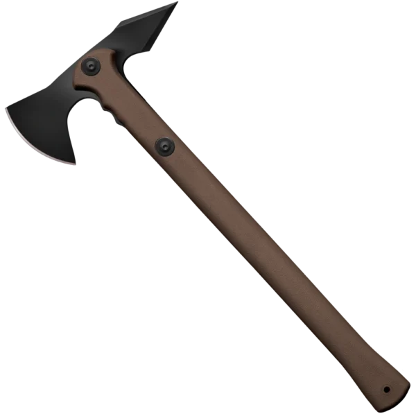 Drop forged from 1055 carbon steel and differentially hardened, the head of the Trench Hawk will withstand tremendous blows and the awful stress of continued throwing. The handle of the Trench Hawk is also highly resistant to shock and impact and will withstand abuse that would easily break even a tough hickory handle. And, as an added benefit, is easily and cheaply replaced when finally worn out or broken from repeated throwing (NOTE: any handle can, and will, break eventually). Finally, to help protect its owner from its cutting edge and sharp spike, it comes with a patented Secure-Ex sheath that features a cleverly articulated design.