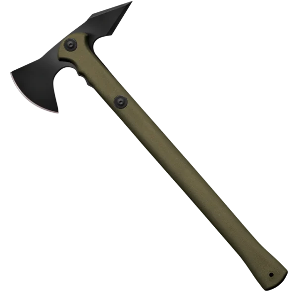 Drop forged from 1055 carbon steel and differentially hardened, the head of the Trench Hawk will withstand tremendous blows and the awful stress of continued throwing. The handle of the Trench Hawk is also highly resistant to shock and impact and will withstand abuse that would easily break even a tough hickory handle. And, as an added benefit, is easily and cheaply replaced when finally worn out or broken from repeated throwing (NOTE: any handle can, and will, break eventually). Finally, to help protect its owner from its cutting edge and sharp spike, it comes with a patented Secure-Ex sheath that features a cleverly articulated design.