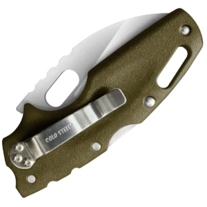 - Folding knife made from AUS-8A stainless steel with a satin finish in a wharncliffe style. OD Green Griv-Ex handles with lanyard hole and pocket clip. Uses cold steel's secure Tri-Ad locking mechanism.