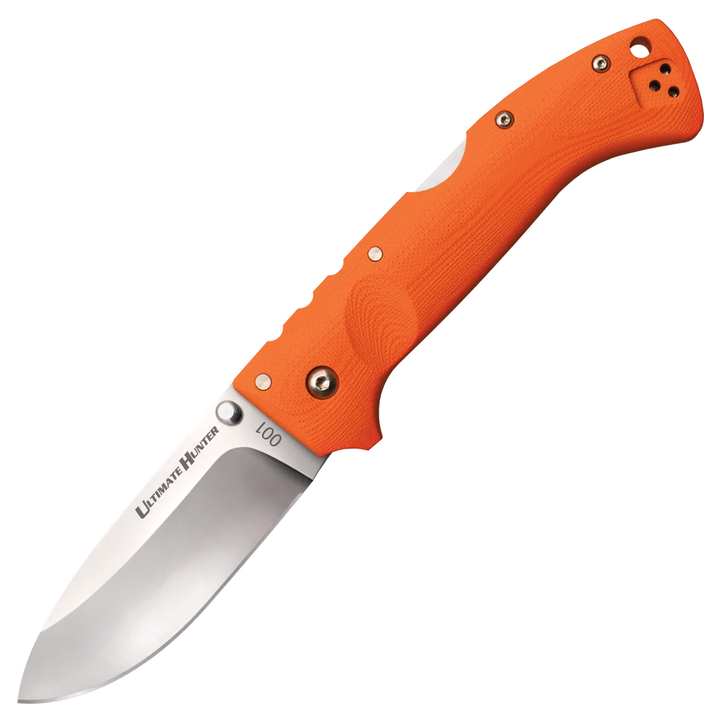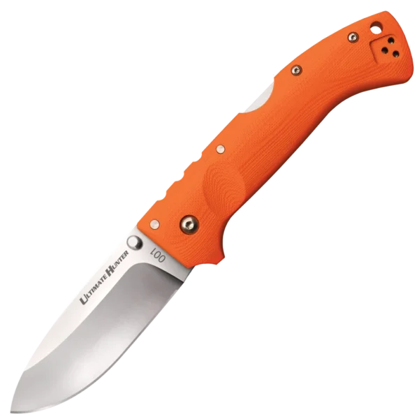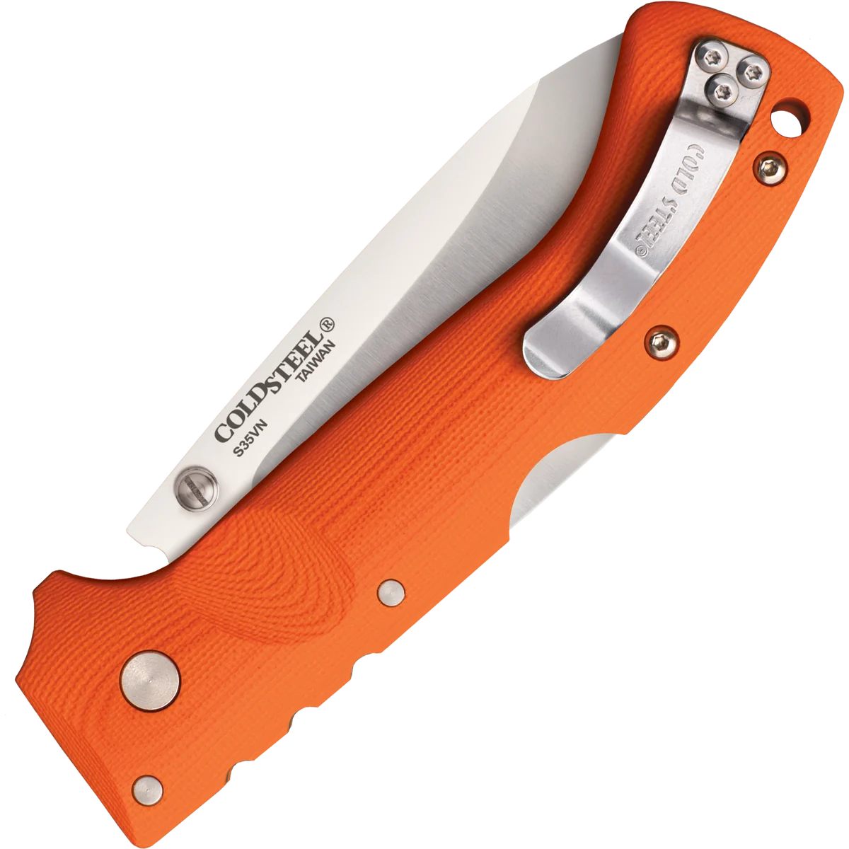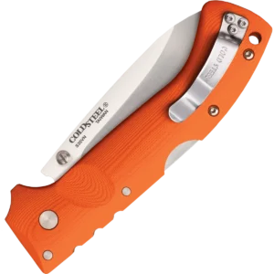 - Folding knife made from S35VN Stainless Steel with a satin finish in a drop point style. Orange G10 handle with a lanyard hole and reversible pocket clip. Uses the Tri-Ad locking mechanism.