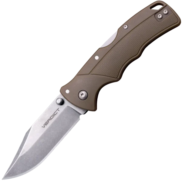 Available in a range of colours and blade styles, the Verdict range utilises sturdy 4116 Stainless Steel and texturised Glass Filled Nylon handles, topped off with Cold Steels famous Tri-Ad Lock! This model features a 3" Clip Point blade in a stonewash finish for a rugged look. The handle is constructed from "Flat Dark Earth" GFN, with a textured finish, and contouring on the handle guides the hand into place for a superior grip that won't let you down, even in wet conditions. The knife is finished with an ambidextrous thumb stud for quick and easy deployment and a steel pocket clip.