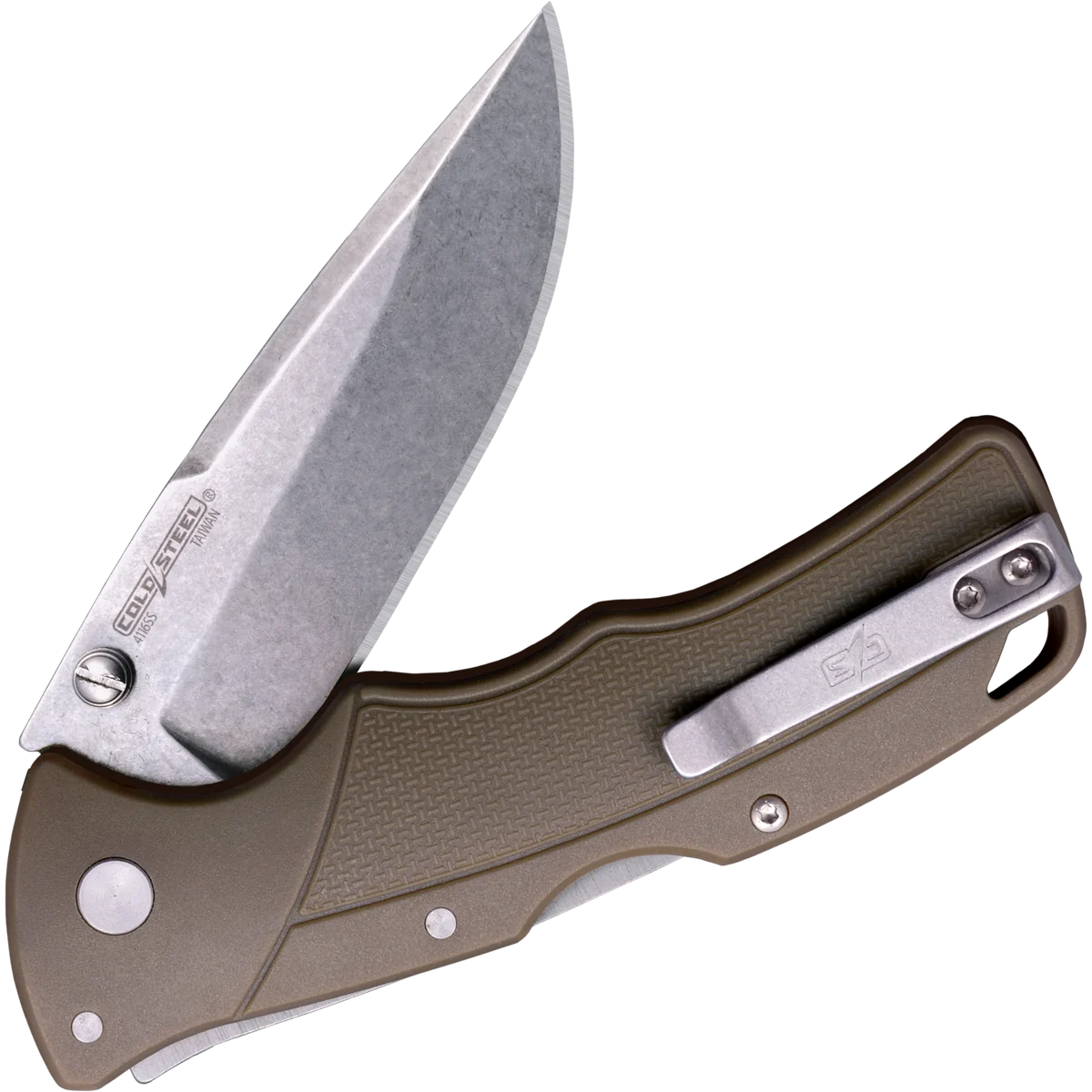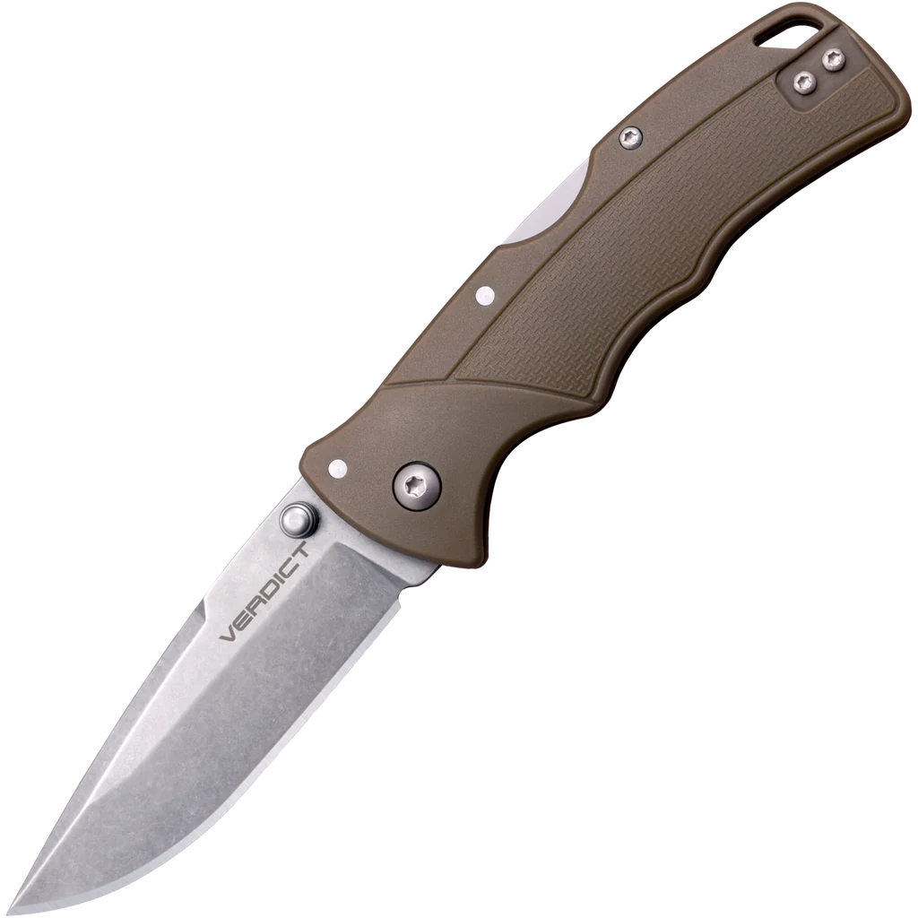 New from Cold Steel for 2022 – The Verdict folding knife collection! Available in a range of colours and blade styles this versatile range utilises sturdy 4116 Stainless Steel and texturised Glass Filled Nylon handles, topped off with Cold Steels famous Tri-Ad Lock! This model features a 3" Spear Point blade in a stonewash finish for a rugged look. The handle is constructed from GFN in the classic Cold Steel "Flat Dark Earth"colour. The textured finish and contouring on the handle guides the hand into place for a superior grip that won't let you down, even in wet conditions. The knife is finished with an ambidextrous thumb stud for quick and easy deployment and a black pocket clip.