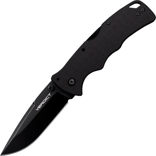 New from Cold Steel for 2022 – The Verdict AUS10A folding knife collection! Available in a variety of colours, blade styles and blade materials this versatile range utilises AUS10A Stainless Steel and texturised G-10 handles, topped off with Cold Steels famous Tri-Ad Lock! This model features a 3" Spear Point blade in a black DLC finish for a more tactical look. Black coating not only protects the blade from wear and tear but reduces glare and reflections. The handle is constructed from black G-10 for a sleek sophisticated feel, while the textured finish and contouring guides the hand into place for a superior grip that won't let you down, even in wet conditions. The knife is finished with an ambidextrous thumb stud for quick and easy deployment and a black pocket clip.