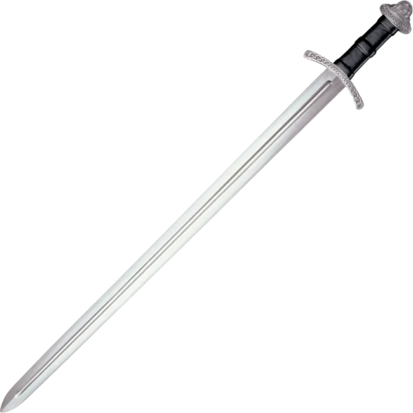 The typical Viking sword of the 9th and 10th centuries featured a long wide blade with a broad central fuller and two keen edges. The preferred stroke was a hard slash or chopping blow. A simple guard with forward curving quillions was often utilized and combined with an equally utilitarian wooden handle that was covered with leather, bone, or even cast in brass. What really made the Viking Sword so distinctively recognizable from its contemporaries was its heavy 5 lobed pommel used to balance the long blade. Our sword has features in common with its historical counterpart. It has a double edged blade, hand forged out of high carbon steel and then polished to a brilliant lustre. The wooden handle is covered in leather and is supported by a simple, elegant guard at one end and an equally handsome 5 lobed pommel at the other. Both guard and pommel feature traditional Celtic knot embellishments. To house the keen double edge blade each of our swords is supplied with a wood scabbard covered in black leather and reinforced with a highly polished steel chape and throat.