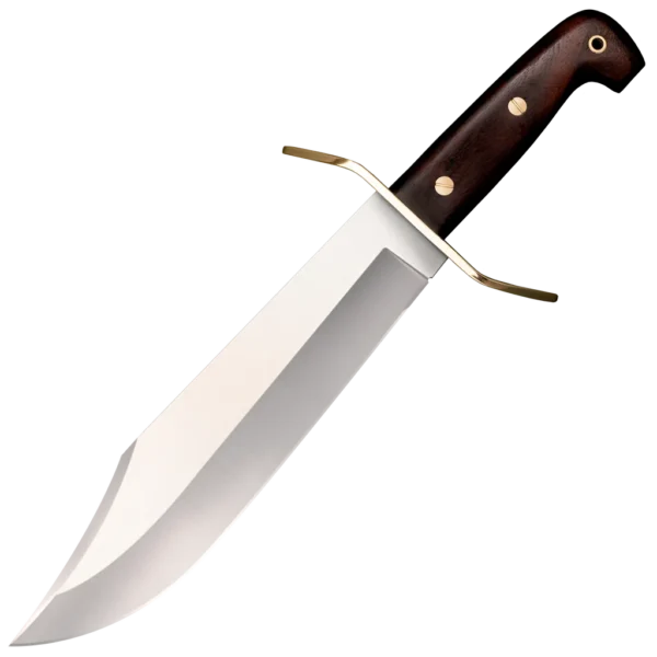 - Full tang fixed knife made from 1090 carbon steel with a satin finish in a bowie style. Rosewood handle with brass screws, brass guard and lanyard hole, also includes a leather sheath for transportation.