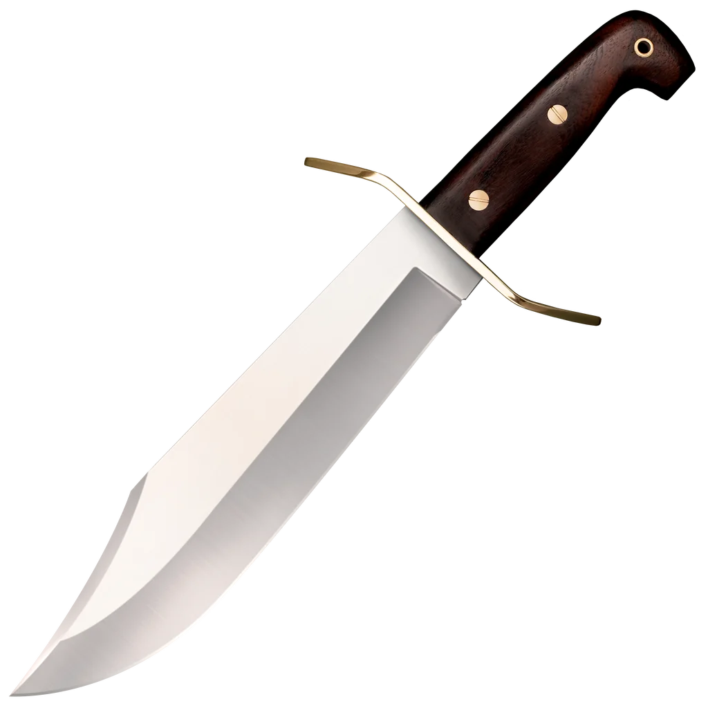 Styled like the iconic big blades featured in Western TV shows and movies, our Wild West Bowie is a noteworthy American classic. The blade is made from 1090 Carbon Steel. It is a long wide blade with weight forward balance and is saber ground and fortified with a false edge to assure maximum cutting, chopping, and piercing power. The handle has a classic profile, featuring Rosewood scales attached to the full tang with brass screws, and it has the characteristic “S” patterned brass handguard to protect your fingers and enhance its defensive potential. The Wild West Bowie is kitted with a traditional black leather sheath that features a brass swivel belt loop and leather leg strap.