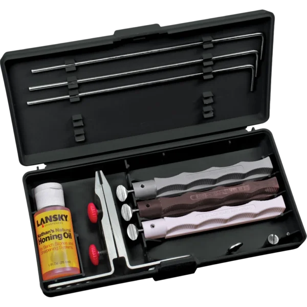 The Ultimate in Sharpening Systems Technology Safe, Easy and Convenient to Use. The Lansky Controlled-Angle Sharpening System is designed to give your blade a professional, razor sharp edge every time. Includes Soft Arkansas Hone Hard Arkansas Hone Black Hard Arkansas Hone All Systems Include Patented, precision-engineered, multi-angle, flip-over knife clamp. Sharpening hones on color-coated, finger-grooved safety holders One guide rod for each honing stone Specially formulated honing oil Extra long knife clamp screws Custom molded storage/carrying case to hold all system components Complete easy-to-follow multi-lingual instructions