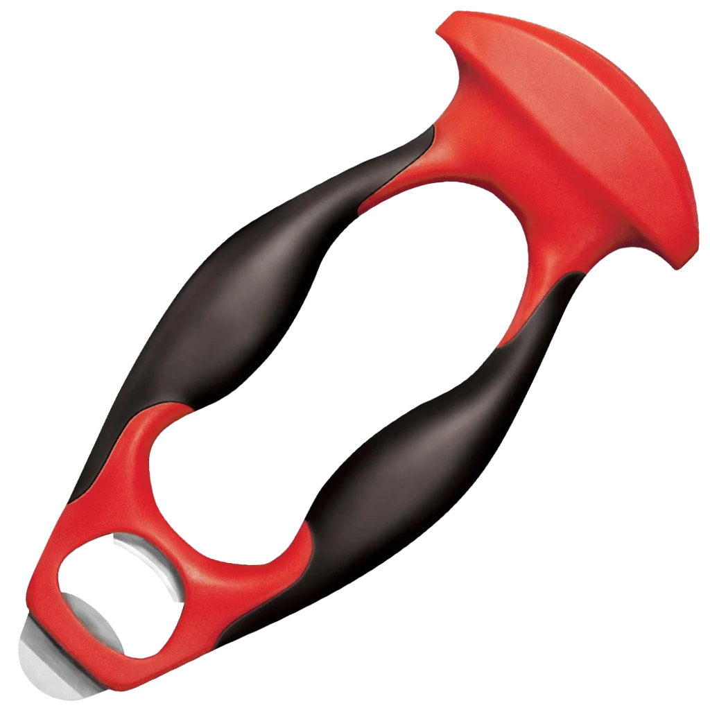 Ergonomic red composition housing with black rubberized grips. Features: pull-through carbide and ceramic sharpeners, convenient bottle cap opener and beverage tab opener. Carbide sharpens and ceramic polishes. Sharpening angles are pre-set at 22.5¡ to achieve a 45¡ inclusive angle. Safe to use for left or right handed individuals. Floats on water.