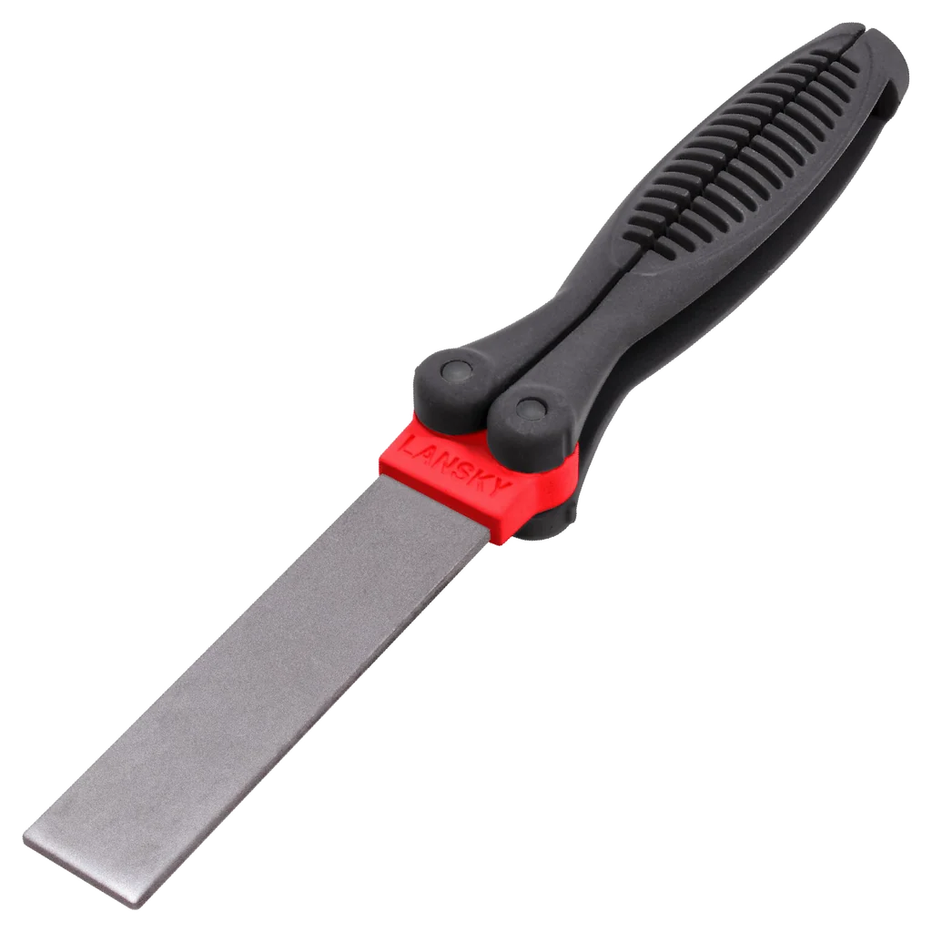 Lansky Double-Sided Diamond Folding Paddles offer two full surface diamond sharpeners in one compact unit, a coarse grit for sharpening or resetting dull edges amd a fine grit for finishing. Both double-sided models have the same folding convenience and rubber over-molded handles and are the same size as our single-side folding diamond paddles. (3.625''x 0.8125''/9.2 x 2.1cm)