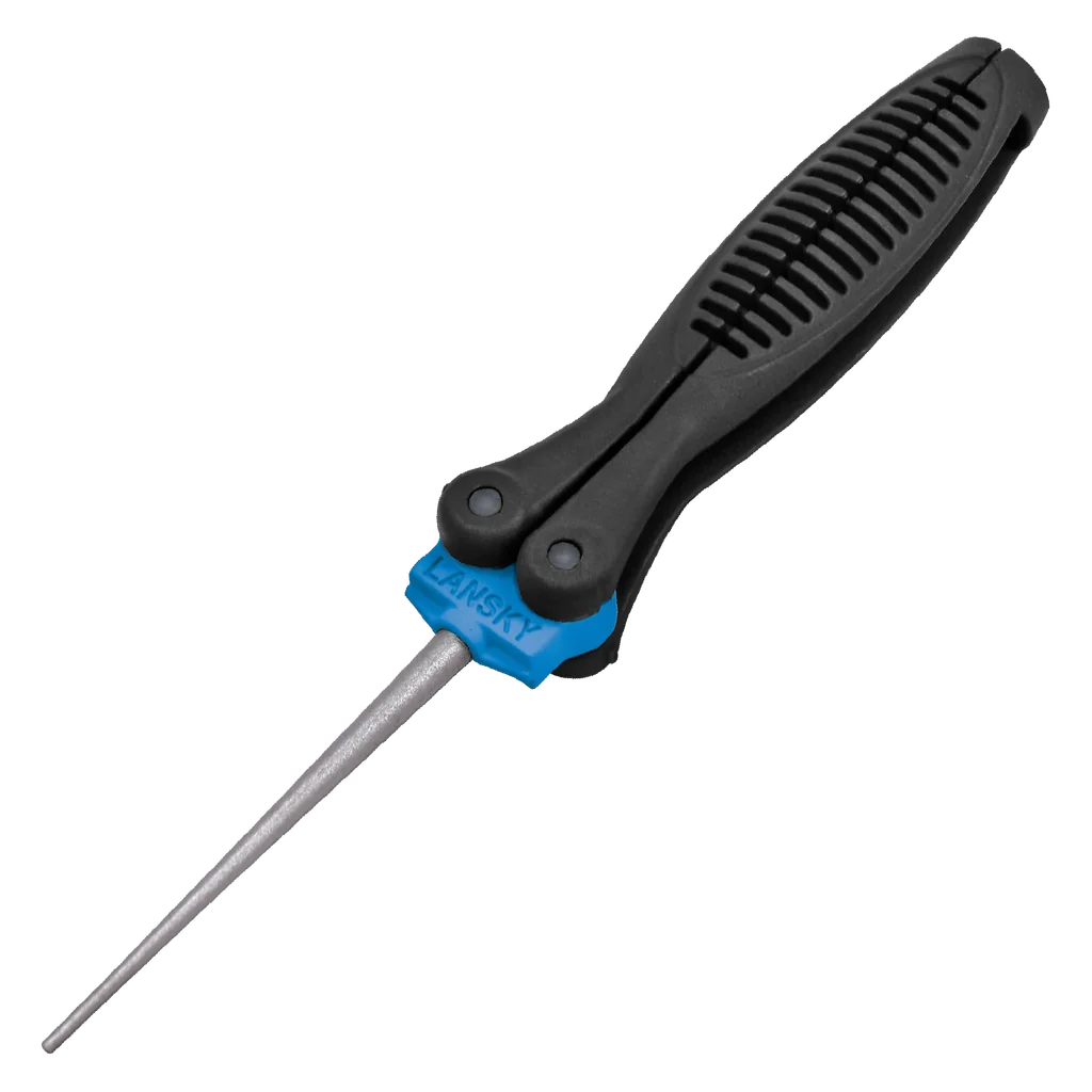 Sharpens regular and SERRATED blades, fish hooks, gut hooks, and many other tools. The fine (600 grit) tapered rod folds into the ergonomic nylon impregnated plastic handle for protection and ease of carrying. The Lansky Tapered Diamond Rod is ideal for every workshop. Renown for their hardness, diamonds are an excellent abrasive for the fast reconditioning and maintenance of all your various tools and knives.