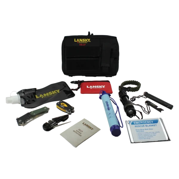 The Lansky P.R.E.P (Preparedness, Resource, Equipment, Pack) was designed as an all-in-one solution for emergency, disaster and survival situations. The tools in the P.R.E.P were selected to improve your chances of prevailing over a variety of scenarios including; evacuation due to natural disaster, unexpected isolation, and escape from dangerous circumstances. The tools in the P.R.E.P are packed in a black canvas bag with the Lansky logo displayed on the front and include: • Emergency blanket • First aid mini-bag • Mini multi-tool • Fishing line • Fishing hook • Fishing sinker • Fishing swivels • Flashlight • Paracord bracelet • Lansky survival guide • Firestarter with compass • Collapsible water bottle • LifeStraw water filter • UTR7 (Responder knife/Blademedic sharpener combo pack) Stay safe, stay sharp, and stay prepared with the Lansky P.R.E.P.