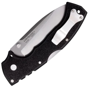 - Folding blade made from AUS-10A stainless steel with a stonewash finish in a drop point style. black textured Griv-Ex handle with a reversible pocket clip and lanyard hole, uses Cold Steel's Tri-Ad locking mechanism.